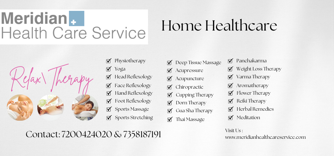At Meridian Health Care Service, we are dedicated to providing exceptional, personalized care to our patients. Our team of experts offers a broad range of services including Physio Varma, foot reflexology, Ayurvedic massage, Thai massage, deep tissue massage, sports massage, sports stretching, weight loss therapy, cupping therapy, Panchakarma, chiropractic, acupuncture, acupressure, and Dorn therapy.